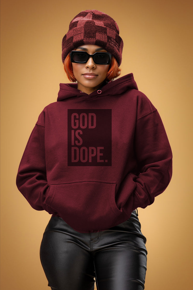 The "God is Dope" Box logo graphic is screen-printed on the front. Details include a pullover hood, inset sleeves, kangaroo pocket, lined hood, tonal shoestring drawcord, sleeve cuff ribbing.