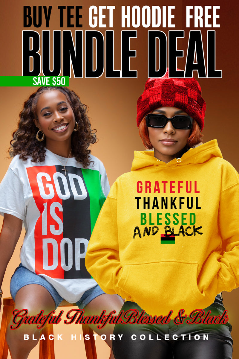 Celebrate faith, gratitude, and Black excellence all in one powerful bundle. This limited-edition Black History Collection features our bold “God Is Dope” tee paired with the statement-making “Grateful, Thankful, Blessed & Black” hoodie—designed to speak before you ever say a word.