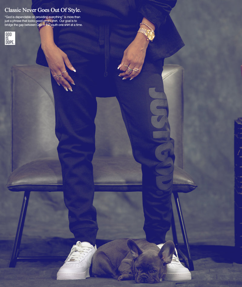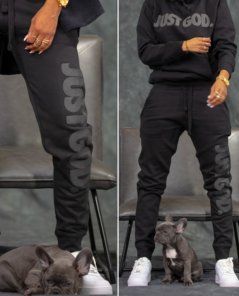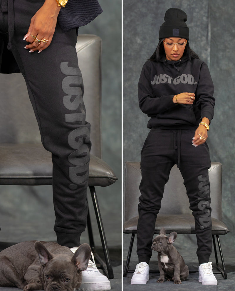A Puffed "Just God" graphic is screen-printed on the front. Details include a Ribbed bottom waistband. Flat draw cord. Angled side pockets.