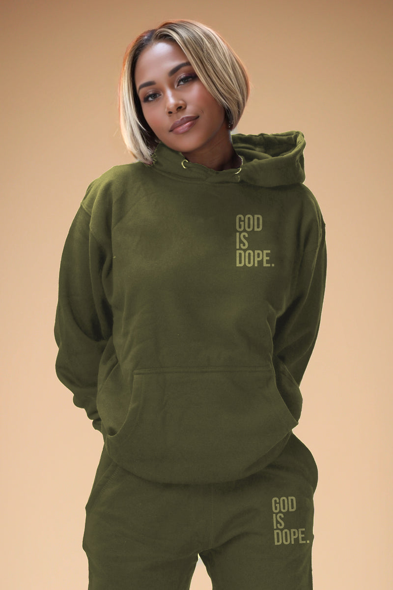 "God is Dope" graphic is screen-printed on the front. Details include a pullover hood, inset sleeves, kangaroo pocket, lined hood, tonal shoestring drawcord, sleeve cuff ribbing.